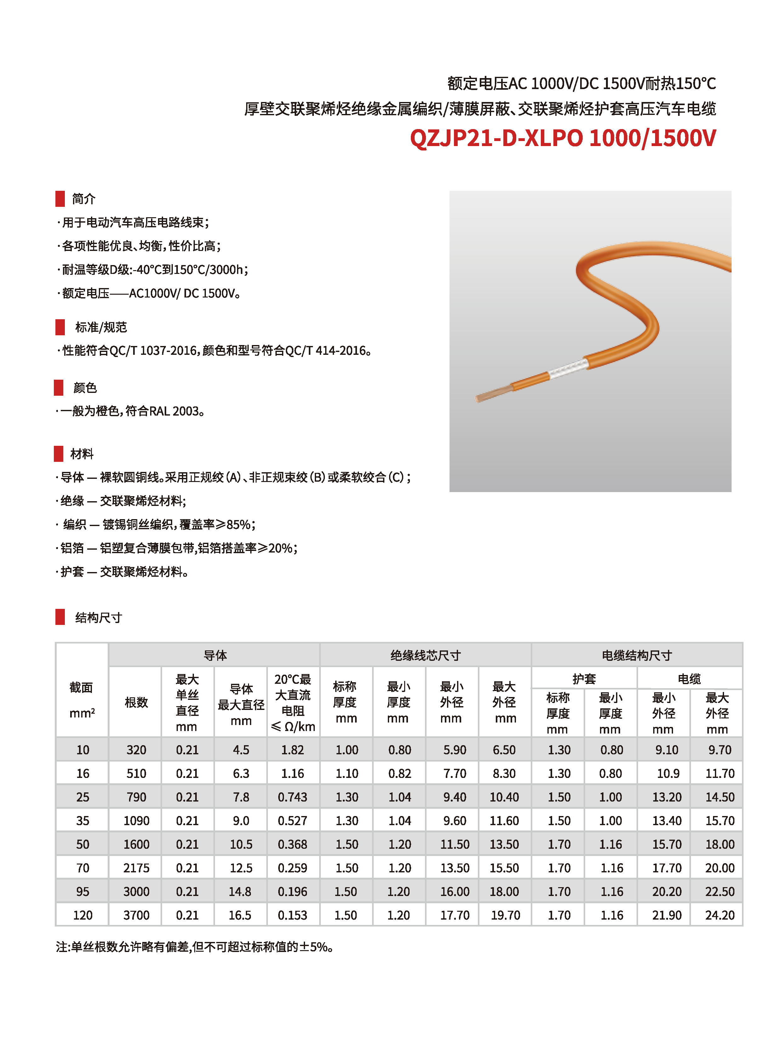 | QZJP21-D/XLPO 1000/1500V | 耐温-40~150℃厚壁交联聚烯烃绝缘金属编织屏蔽/薄膜屏蔽、交联聚烯烃护套电缆 | 10~120mm² | 1芯 | AC 1000/DC 1500V |
