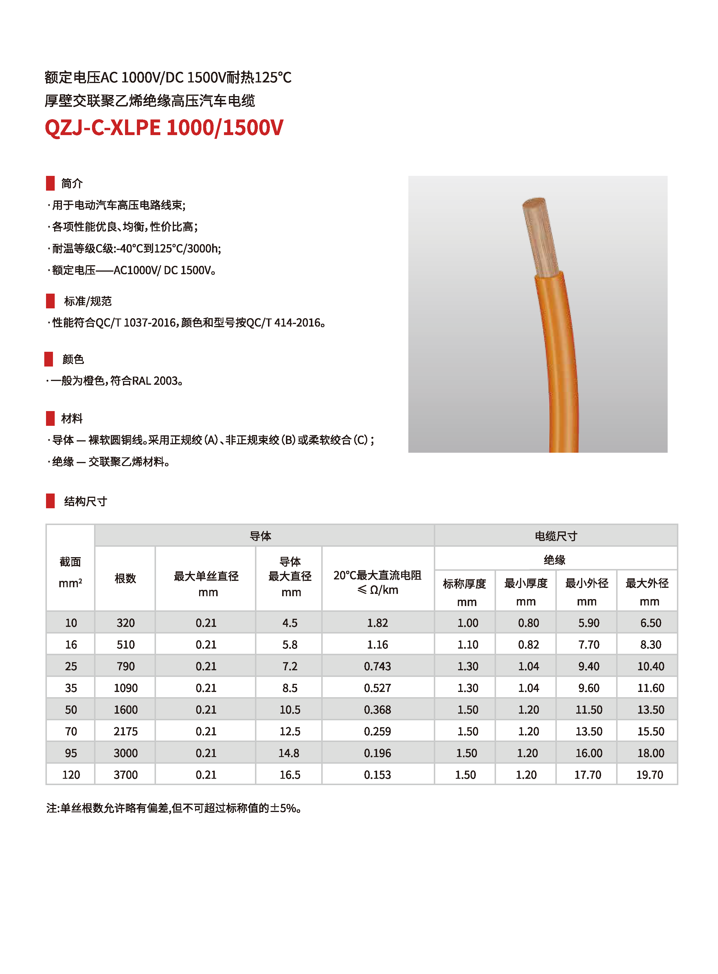 | QZJ-C/XLPE 1000/1500V | 耐温-40~125℃厚壁交联聚乙烯绝缘电缆 | 10~120mm² | 1芯 | AC 1000/DC 1500V |