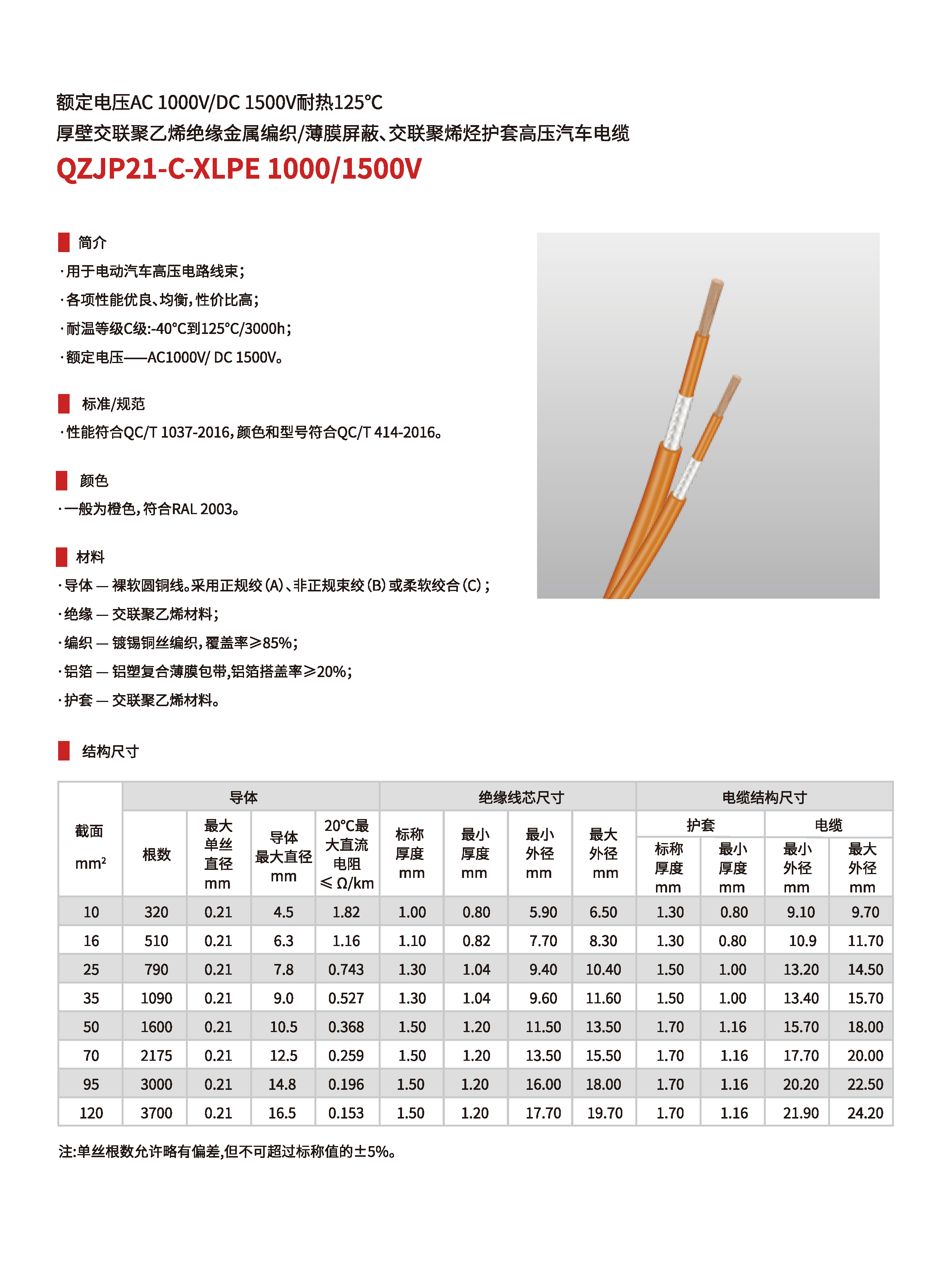 | QBJP2-C/XLPE 600/900V | 耐温-40~125℃薄壁交联聚乙烯绝缘金属编织屏蔽、交联聚烯烃护套电缆 | 1.5~50mm² | 1~5芯 | AC 600/DC 900V |